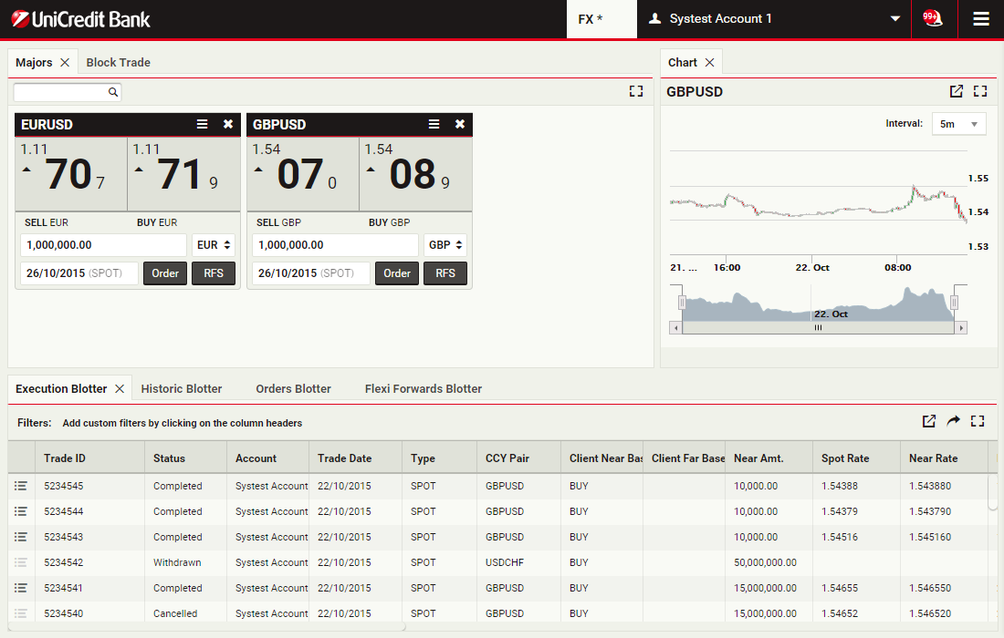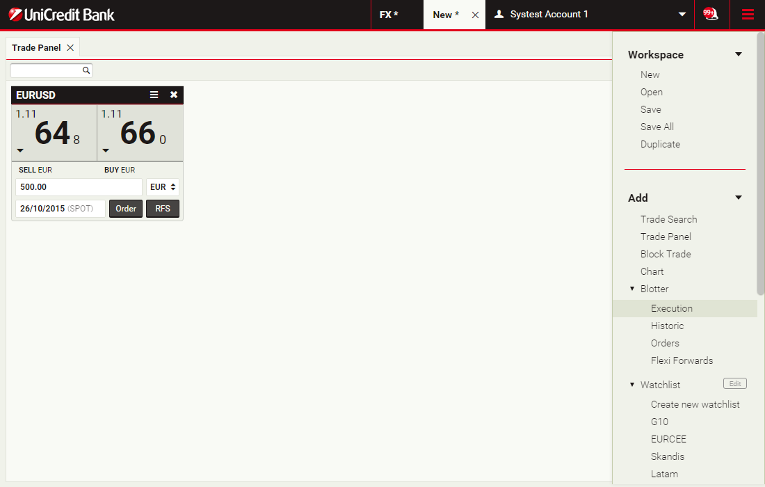 Trading tickets allow you to request an executable streaming quote for spot, outright forwards, flexi forwards and swaps. As soon as you see a price on the ticket, you can click and immediately execute your deal.