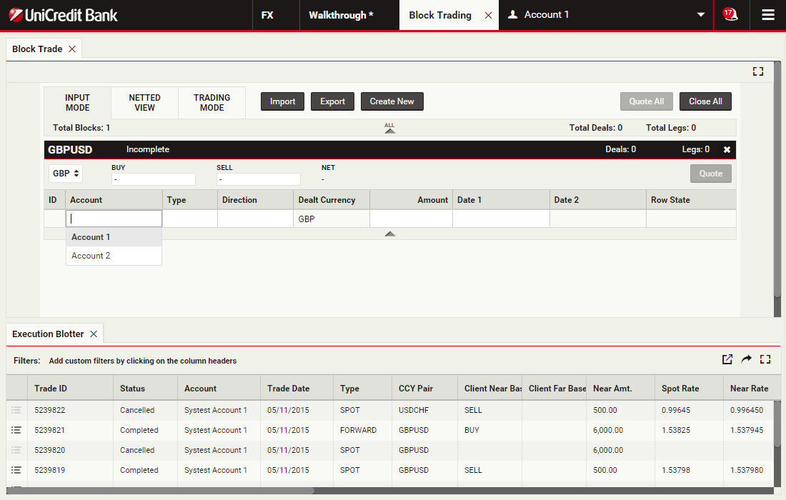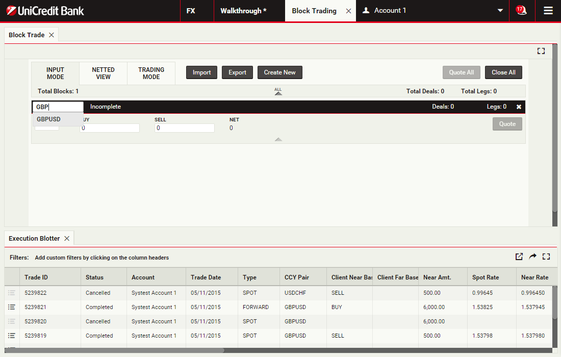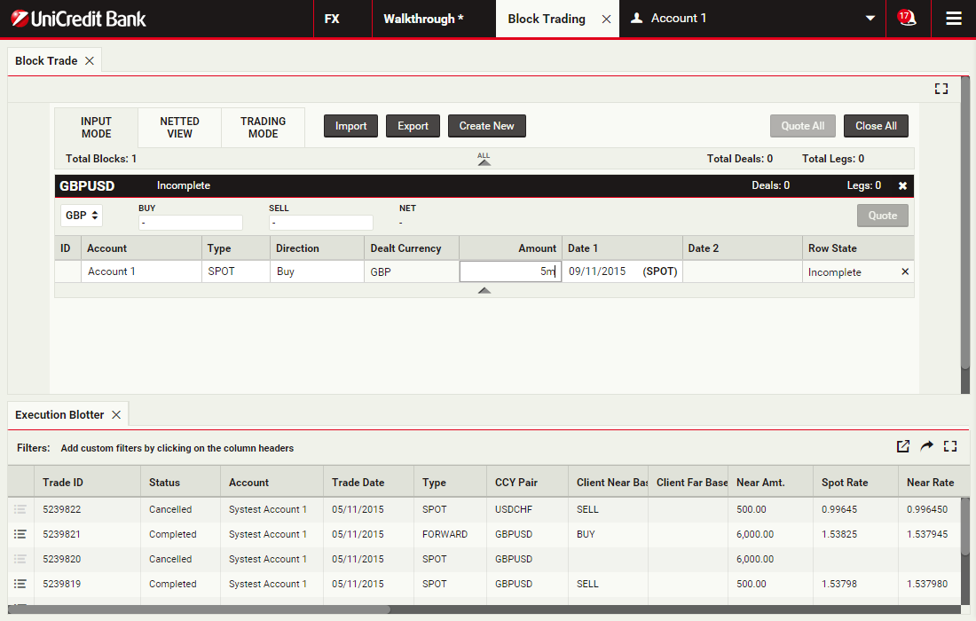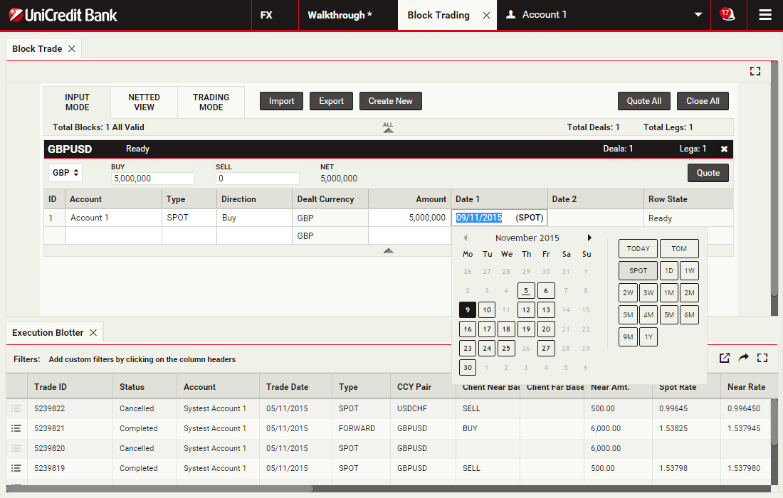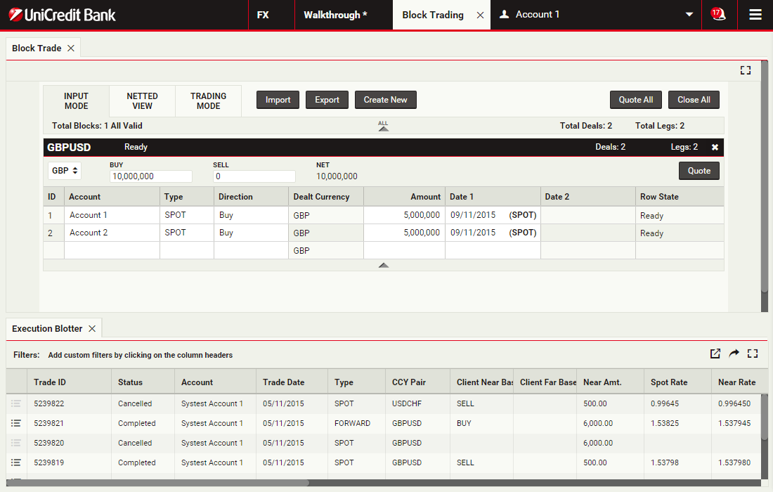 Using block trading, you can submit a request for a single executable quote on simultaneous deals in the same currency pair across multiple accounts and valuation dates. You can enter the deals directly or upload them in a spreadsheet template and UCTrader will automatically validate and net them where possible.