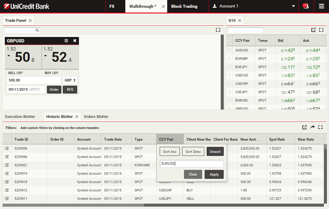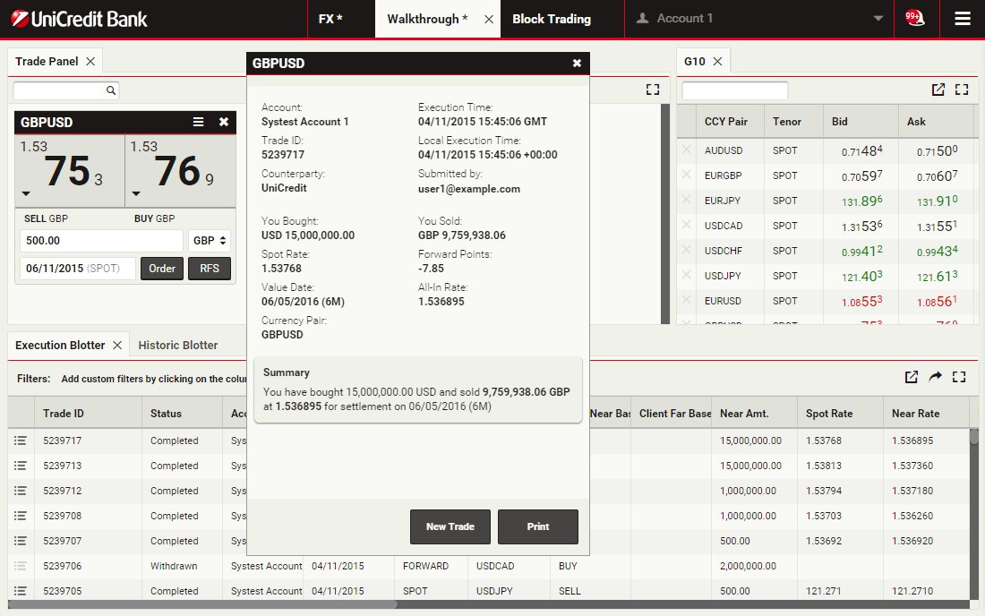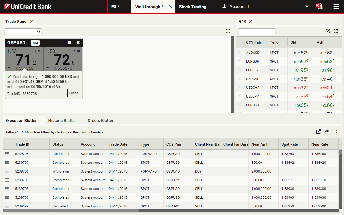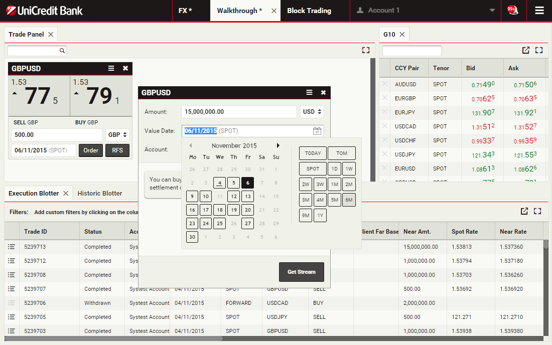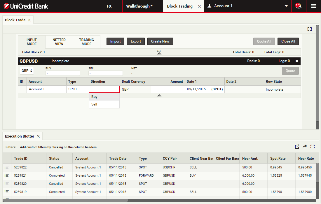 Using block trading, you can submit a request for a single executable quote on simultaneous deals in the same currency pair across multiple accounts and valuation dates. You can enter the deals directly or upload them in a spreadsheet template and UCTrader will automatically validate and net them where possible.