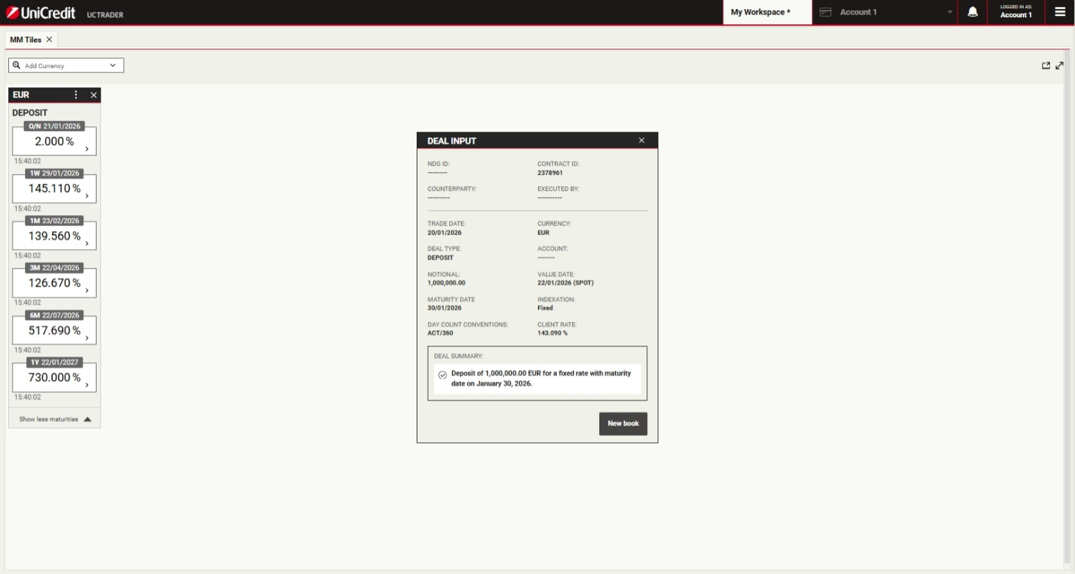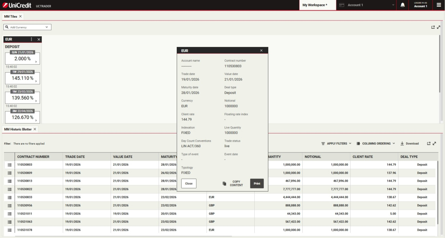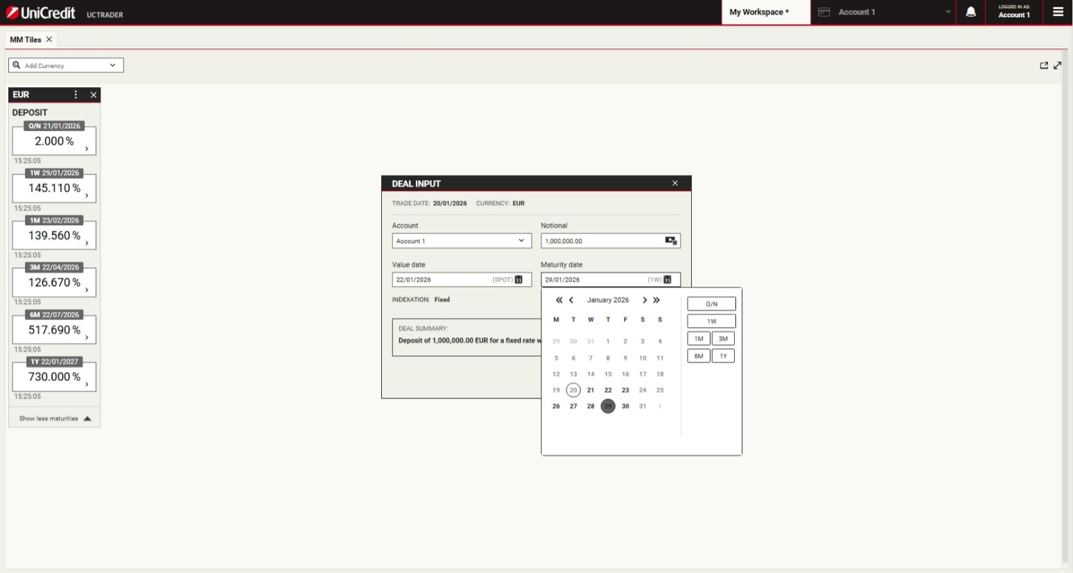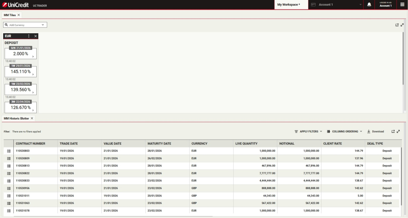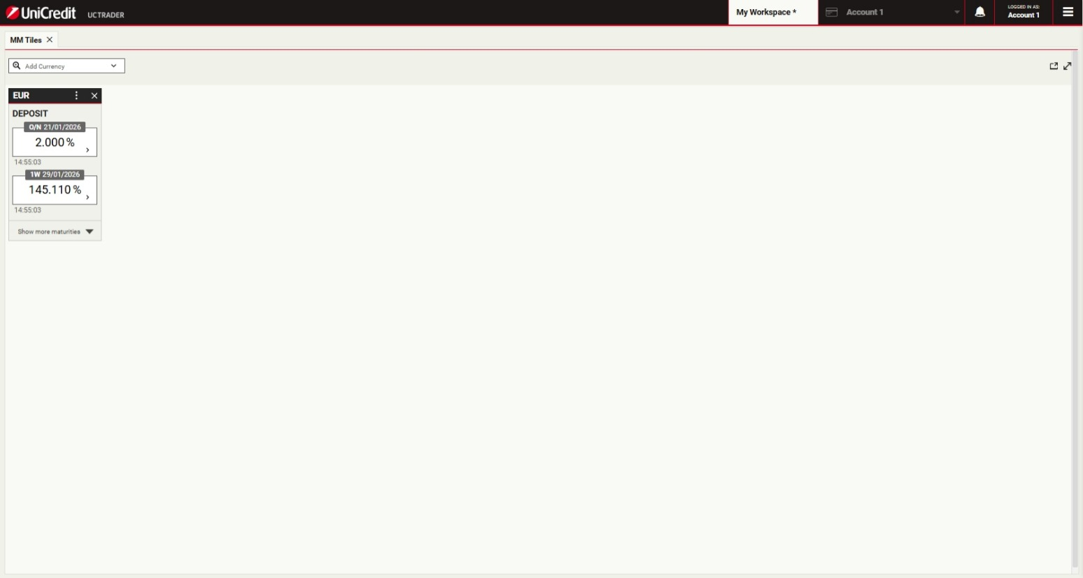 UniCredit is glad to offer Money Markets product via UCTrader platform.This will enable Clients to execute transactions autonomously, in a simple and fast way.Money Market facilitates short-term funding and liquidity management through Deposit instruments with Fixed Rate Interest rate.