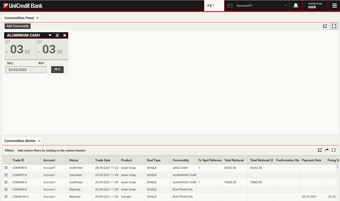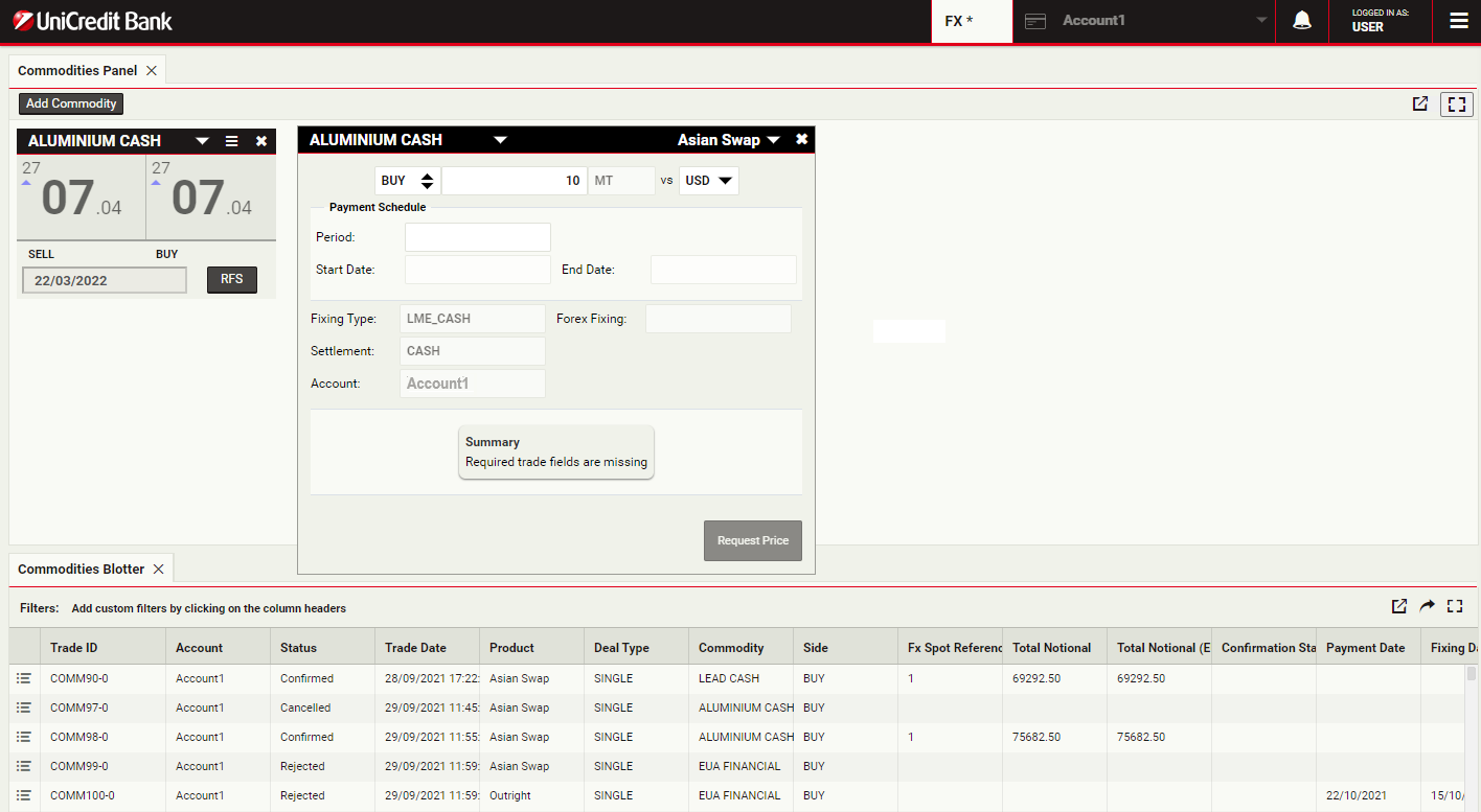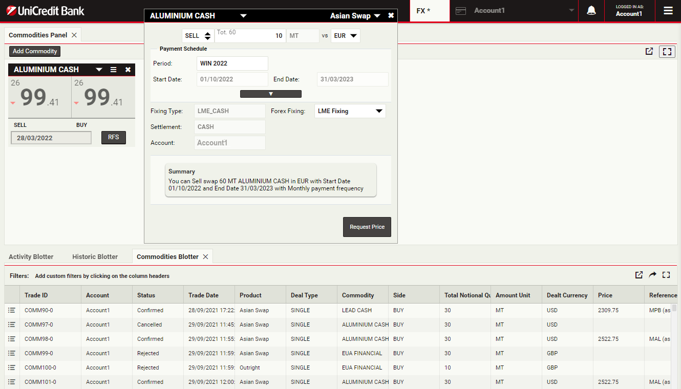 To launch a swap ticket for Aluminium, click RFS on an Aluminium Cash tile
