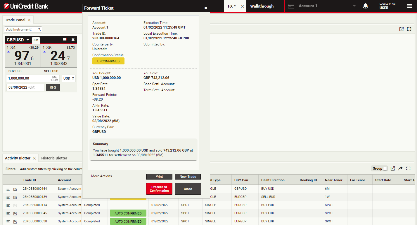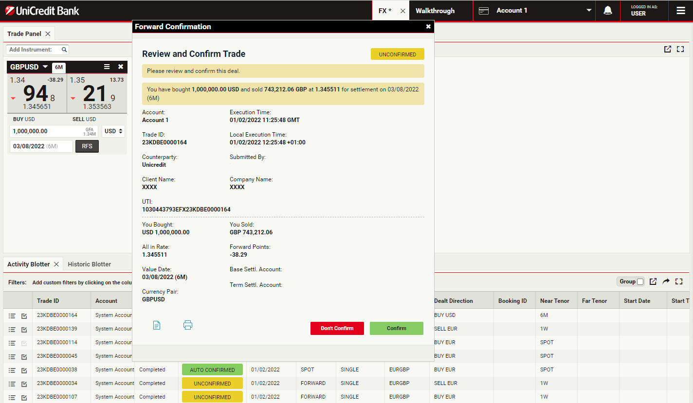 Trades settling before or on the spot date are considered automatically confirmed, whilst all Forward, Swap and Block trades settling after spot must be explicitly confirmed by customers.