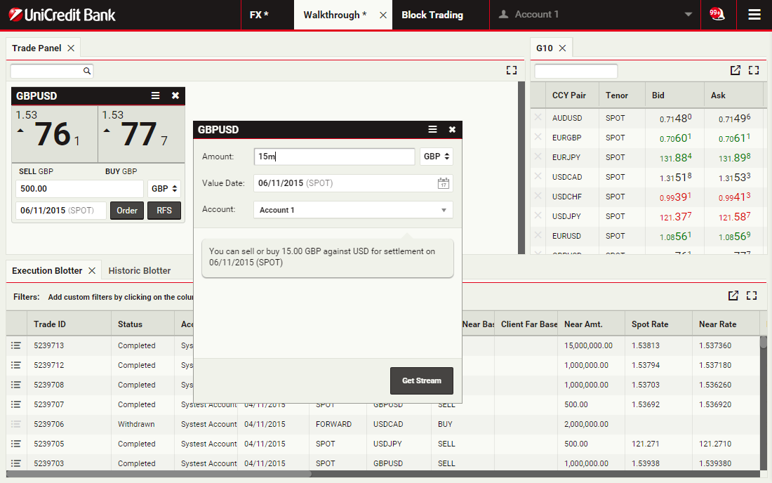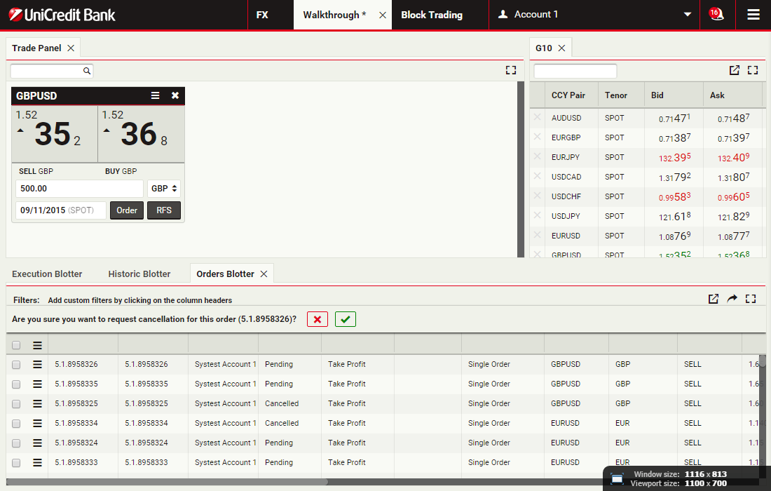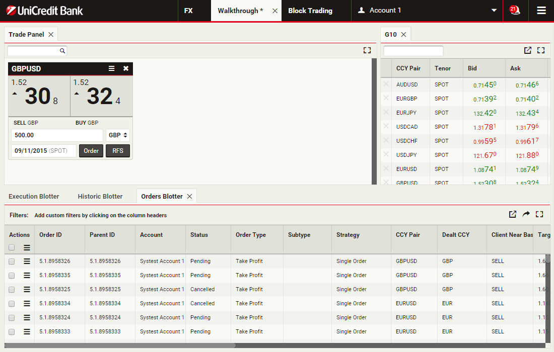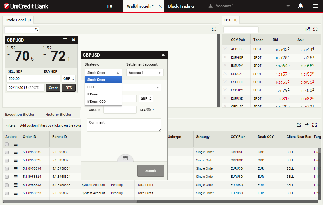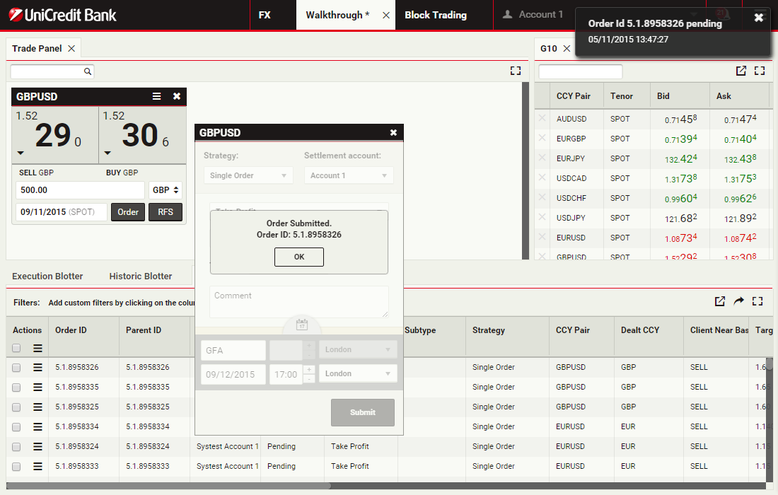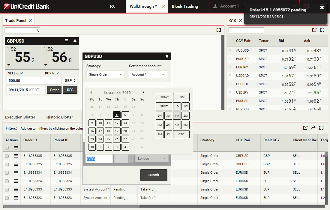 In this walkthrough, you will use a GBPUSD order ticket to prepare and submit a Take Profit order to sell 1 million GBP, with a Time-in-Force (TIF) of 1 month after spot.